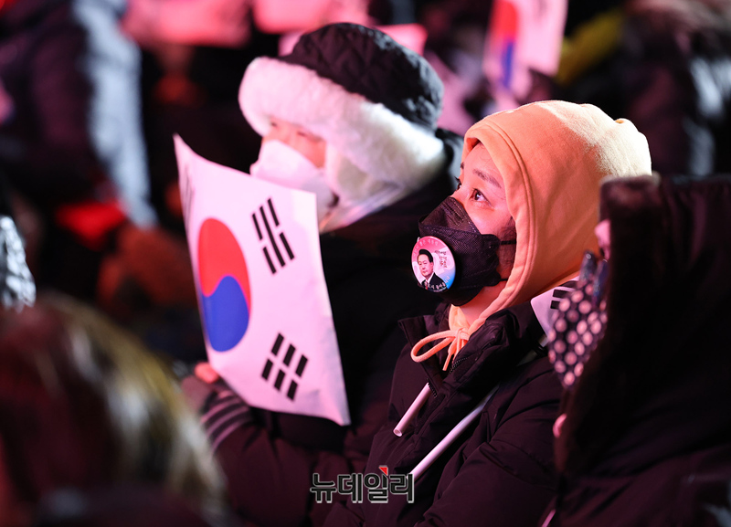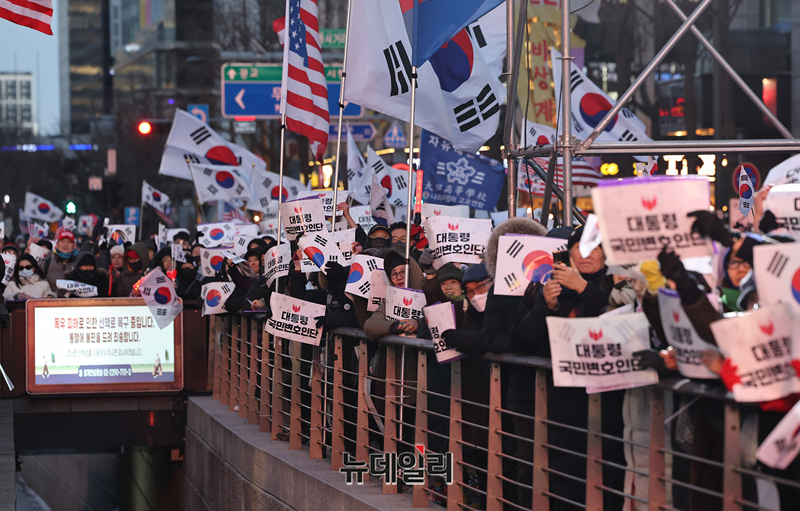 '윤석열 대통령 국민변호인단 출범식' 참가 시민들이 13일 오후 서울 청계광장에서 열린 행사에서 태극기를 들고 구호를 외치고 있다.