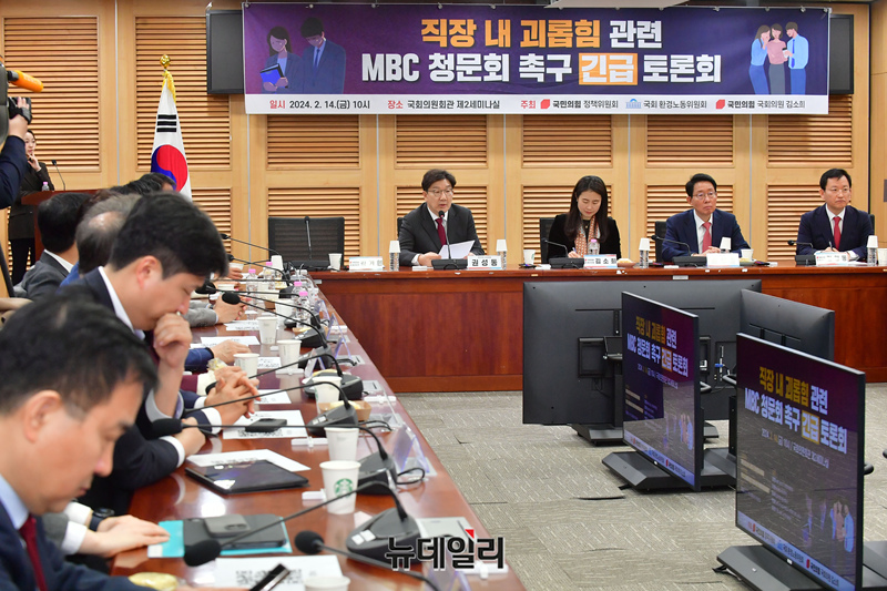 권성동 국민의힘 원내대표가 14일 오전 국회 의원회관에서 열린 직장 내 괴롭힘 관련 MBC 청문회 촉구 긴급 토론회에서 발언을 하고 있다.