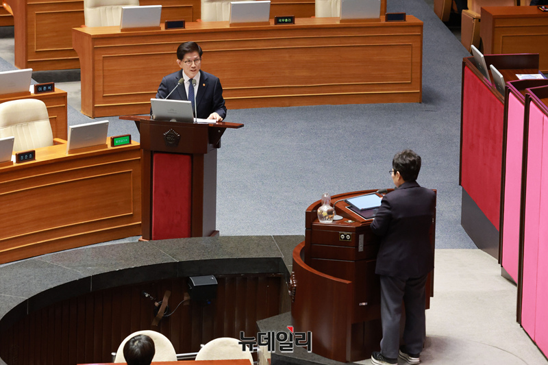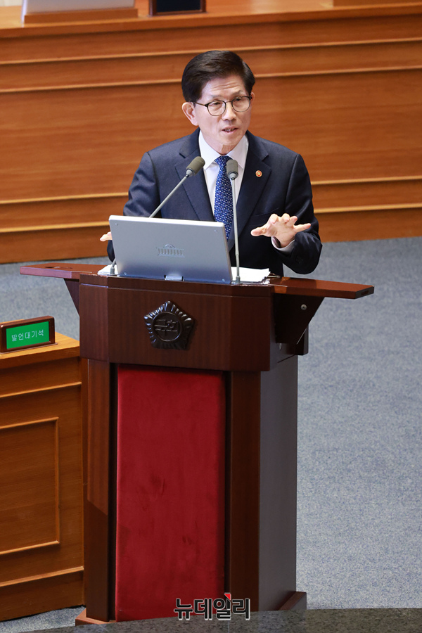 김문수 고용노동부 장관이 14일 오전 국회에서 열린 본회의 교육·사회·문화 분야 현안 관련 대정부질문에서 의원들의 질문에 답하고 있다.