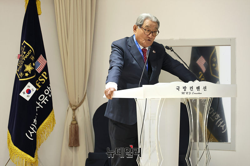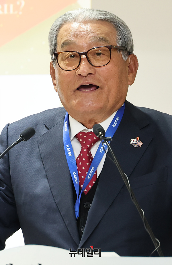 김진영 한미자유안보정책센터 회장이 14일 오후 서울 용산구 국방컨벤션에서 열린 대한민국 체제수호 결의대회에서 인사말을 하고 있다.