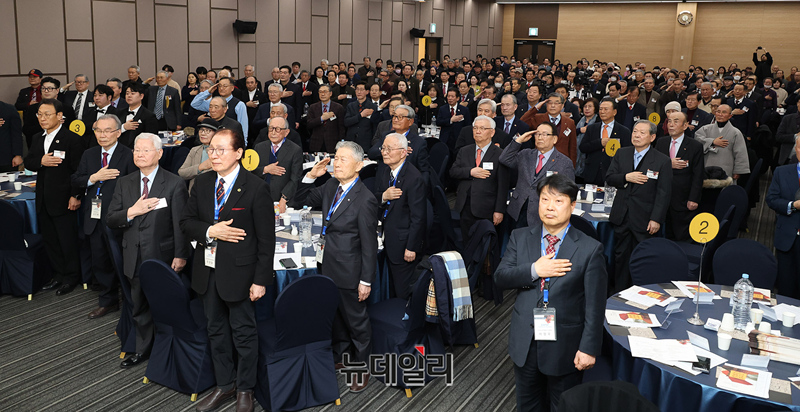 한미자유안보정책센터가 주최하는 대한민국 체제수호 결의대회가 14일 오후 서울 용산구 국방컨벤션에서 진행되고 있다.