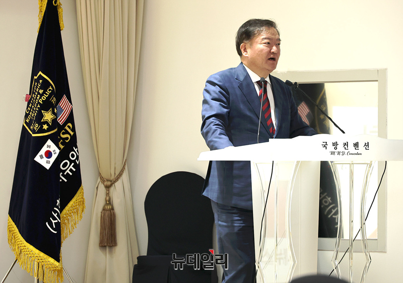 민경욱 전 국회의원이 14일 오후 서울 용산구 국방컨벤션에서 열린 대한민국 체제수호 결의대회에서 인사말을 하고 있다.