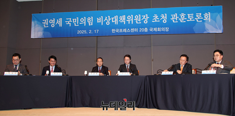 권영세 국민의힘 비상대책위원장이 17일 오전 서울 중구 프레스센터 국제회의장에서 열린 관훈클럽 초청 토론회에서 발언하고 있다.
