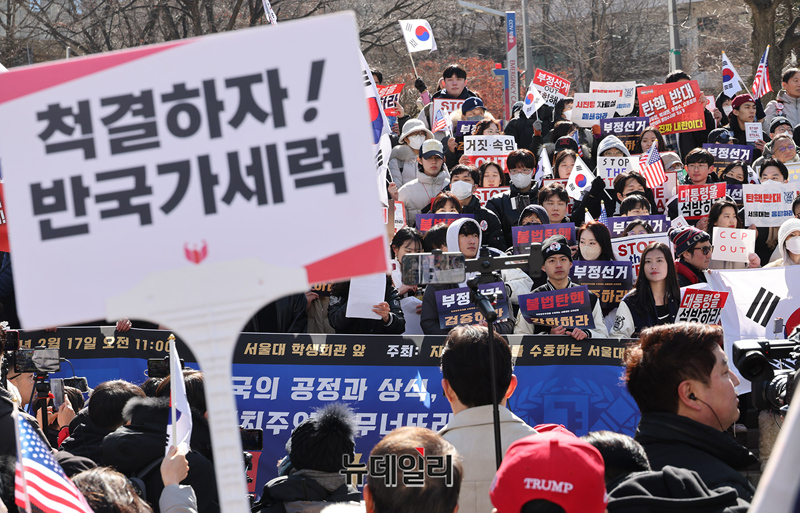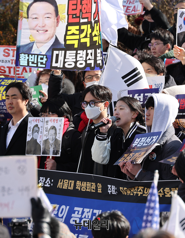 자유민주주의를 수호하는 서울대인 주최로 열린 서울대 탄핵반대 시국선언이 17일 오후 서울 관악구 서울대 아크로폴리스 광장에서 진행되고 있다. 시국선언에는 학생들의 자유발언으로 진행됐다.