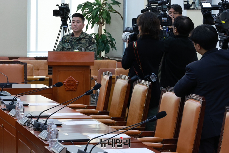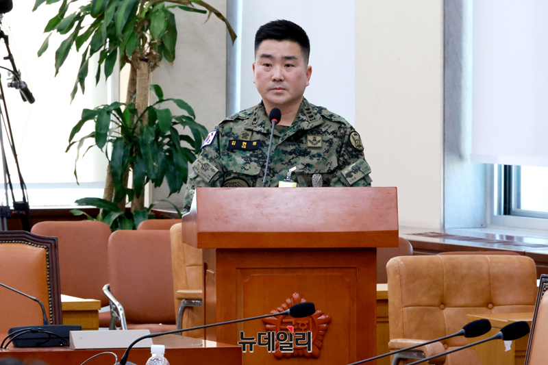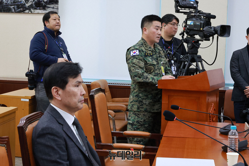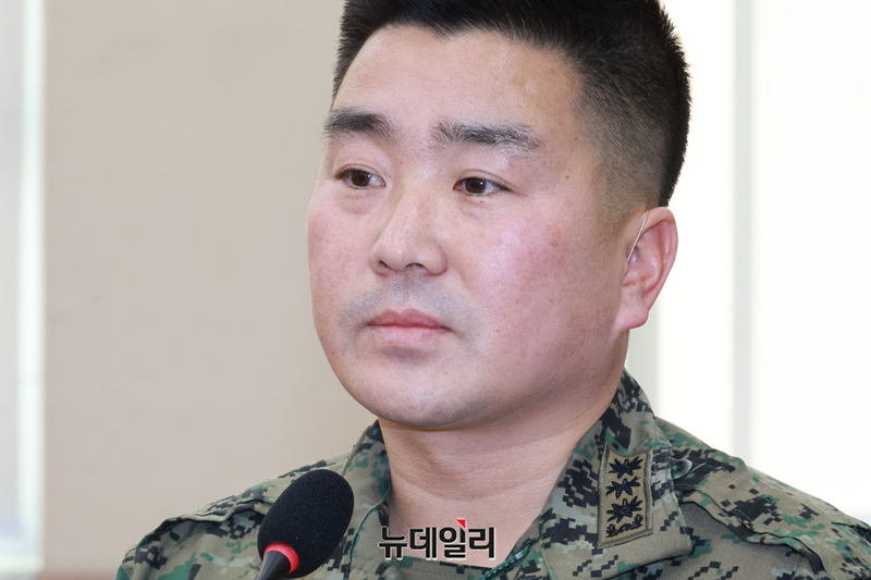 김현태 육군 특수전사령부 707특수임무단장이 17일 오전 국회에서 열린 국방위원회 전체회의에서 더불어민주당 의원들이 퇴장한 가운데 국민의힘 의원들의 질의에 답변하고 있다.