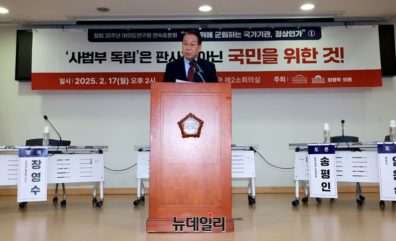 권영세 국민의힘 비상대책위원장이 17일 오후 국회 의원회관에서 열린 '창립 30주년 여의도연구원 연속토론회, 국민 위에 군림하는 국가기관 정상인가'에 참석해 축사를 하고 있다.