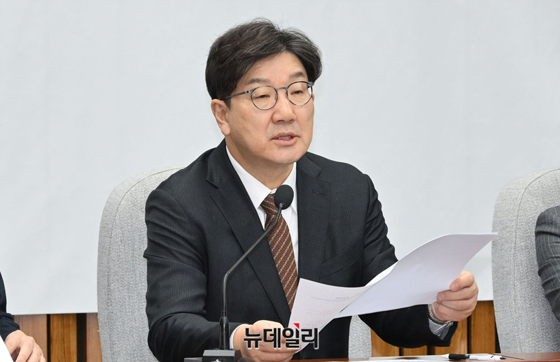 권성동 국민의힘 원내대표가 18일 오전 국회에서 열린 원내대책회의에 참석해 모두발언을 하고 있다.