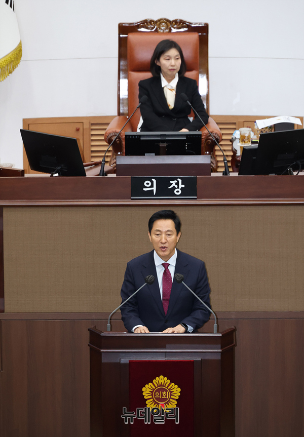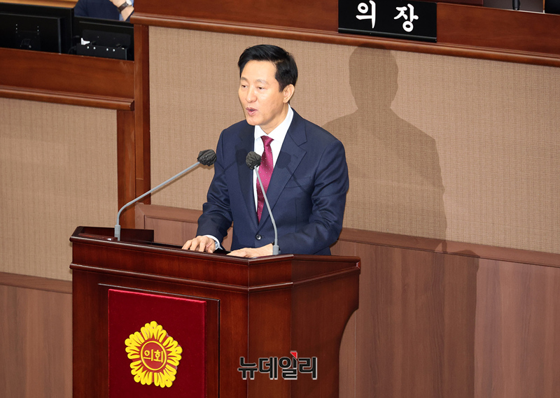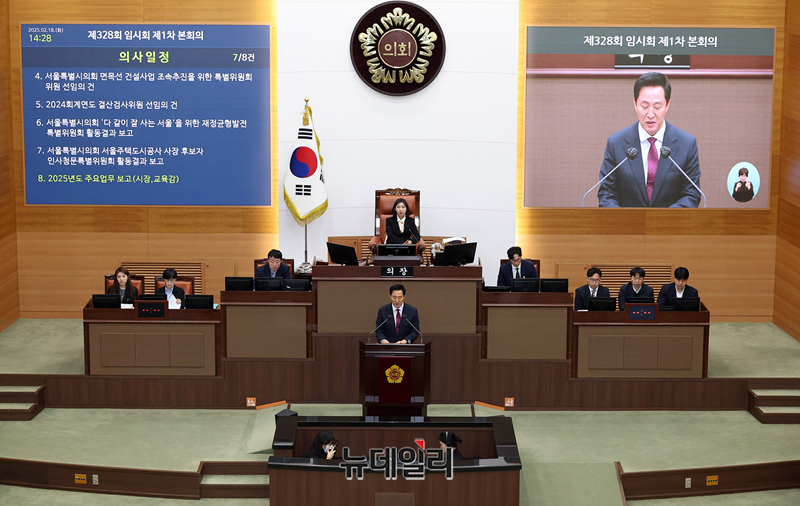 오세훈 서울시장이 18일 오후 서울시의회에서 열린 제328회 임시회 제1차 본회의에서 2025년도 주요업무 보고를 하고 있다.