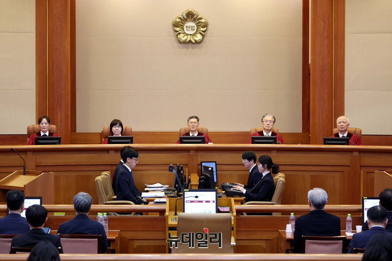 문형배 헌법재판소장 권한대행을 비롯한 재판관들이 18일 서울 종로구 헌법재판소에서 열린 윤석열 대통령 탄핵심판 9차 변론기일에 참석하고 있다. (사진=공동취재단)