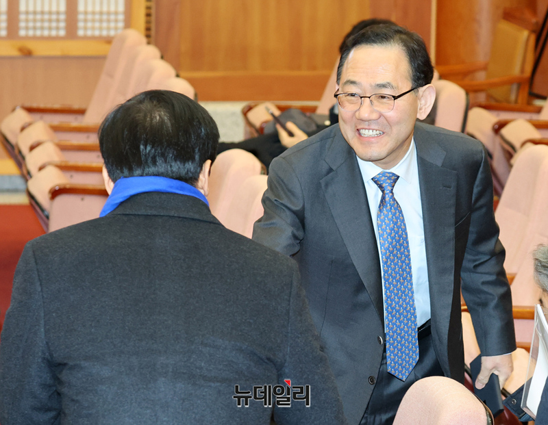 국민의힘 주호영, 나경원 의원이 18일 서울 종로구 헌법재판소에서 열린 '윤석열 대통령 탄핵심판 9차 변론'을 참관해 대화를 나누고 있다. (사진=공동취재단)