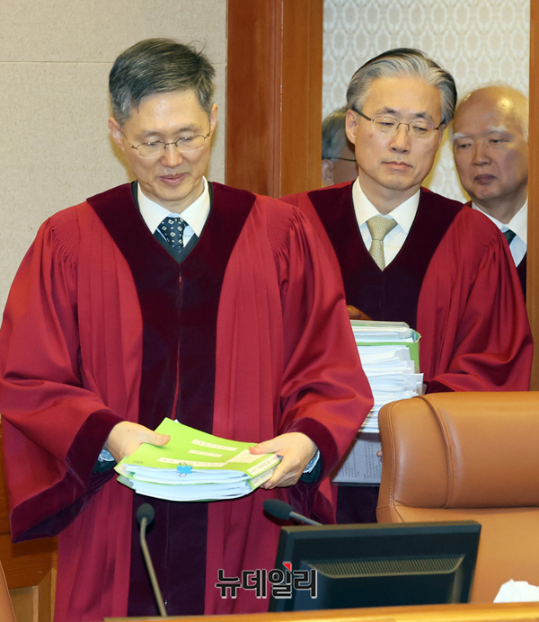 문형배 헌법재판소장 권한대행을 비롯한 헌법재판관들이 18일 서울 종로구 헌법재판소에서 열린 '윤석열 대통령 탄핵심판 9차 변론'에 입장하고 있다. 이날 윤석열 대통령은 법정에 출석하지 않고 구치소로 돌아갔다. (사진=공동취재단)