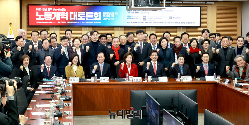 나경원 국민의힘 의원, 권영세 비대위원장, 김문수 고용노동부 장관 등 참석자들이 19일 오전 국회에서 열린 '2030·장년 모두 Win-Win하는 노동개혁 대토론회'에서 기념촬영을 하고 있다.