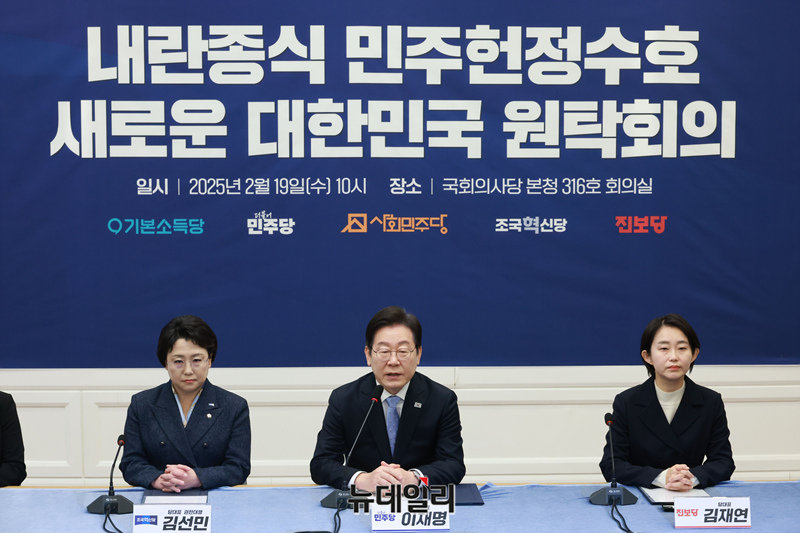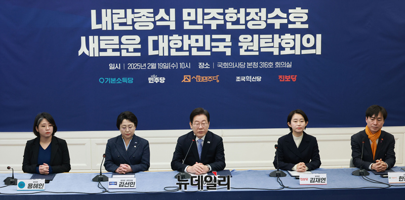 이재명 더불어민주당 대표가 19일 국회에서 열린 '내란종식 민주헌정수호 새로운 대한민국 원탁회의' 출범식에서 발언을 하고 있다.