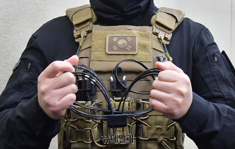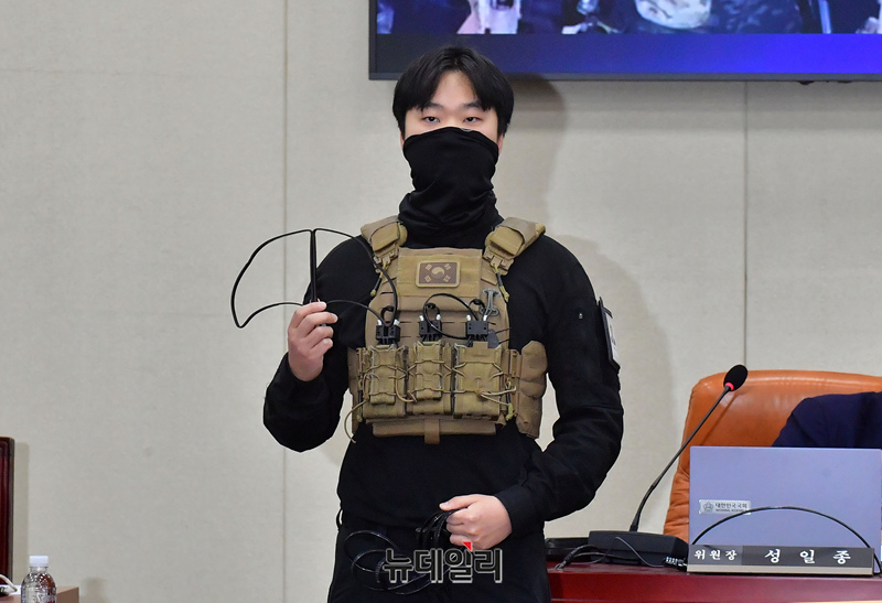 박선원 더불어민주당 의원 보좌관이 20일 오전 국회에서 열린 국방위원회 전체회의에 참석해 707 특임대가 계엄 당시 국회에 반입한 케이블타이 수갑을 휴대하고 있다.
