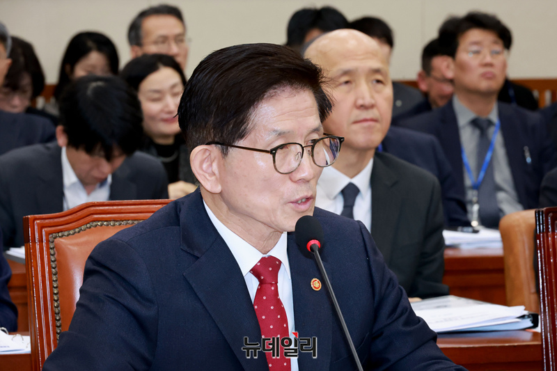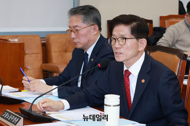 김문수 고용노동부 장관이 20일 국회에서 열린 환경노동위원회 전체회의에 출석해 현안질의에 답하고 있다.