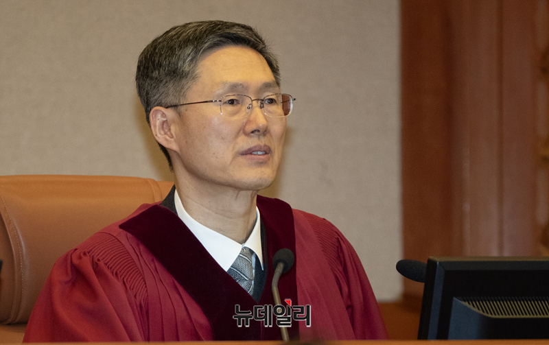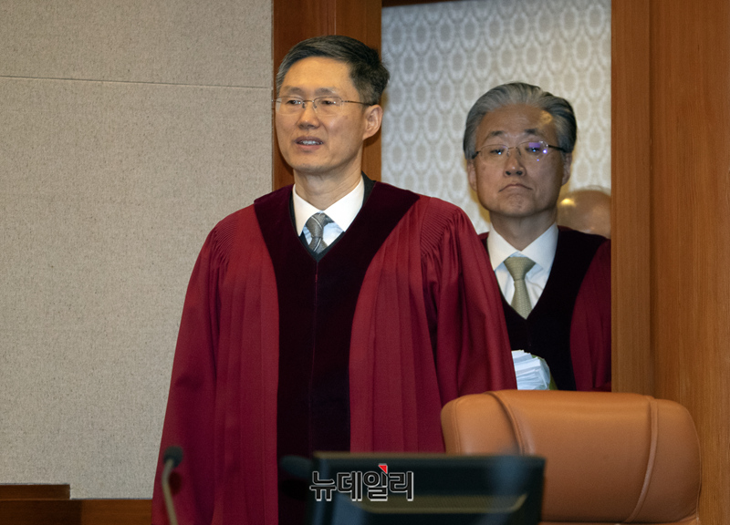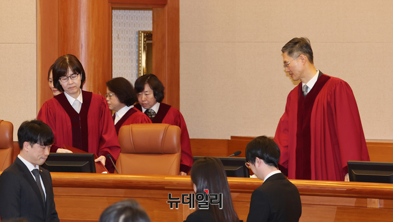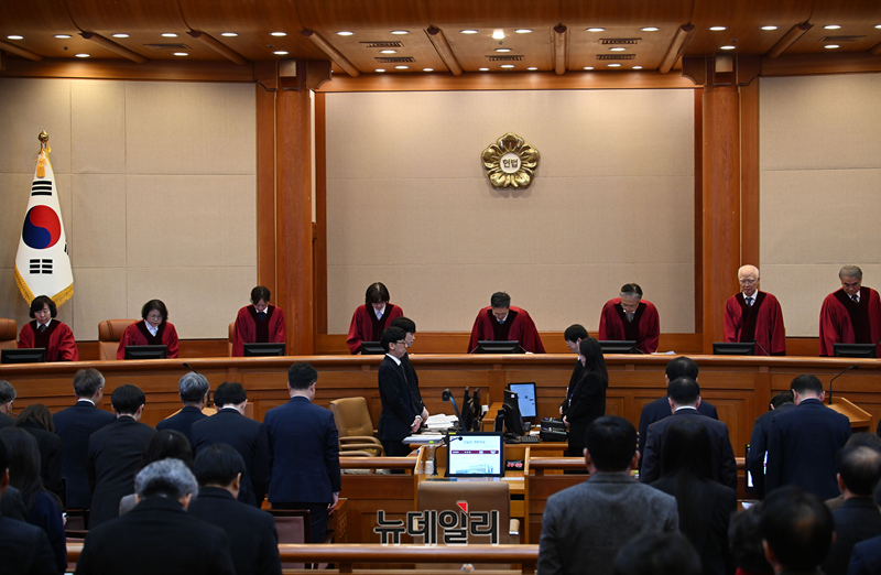문형배 헌법재판소장 직무대행을 비롯한 헌법재판관들이 20일 오후 서울 종로구 헌법재판소에서 열린 윤석열 대통령 탄핵심판 10차 변론에 자리하고 있다. (사진=공동취재단)