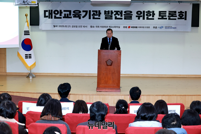 권영세 국민의힘 비상대책위원장이 21일 오전 국회 의원회관에서 조정훈 의원 주최로 열린 대안교육기관 발전을 위한 토론회에 참석해 축사를 하고 있다.