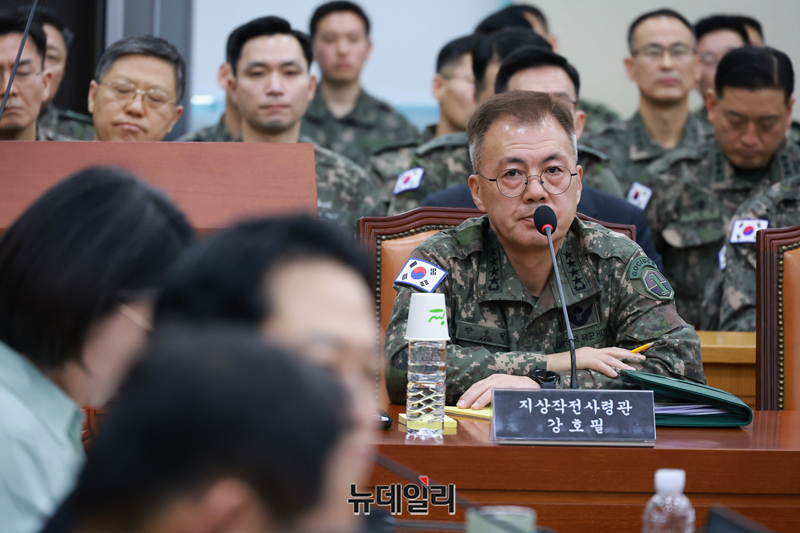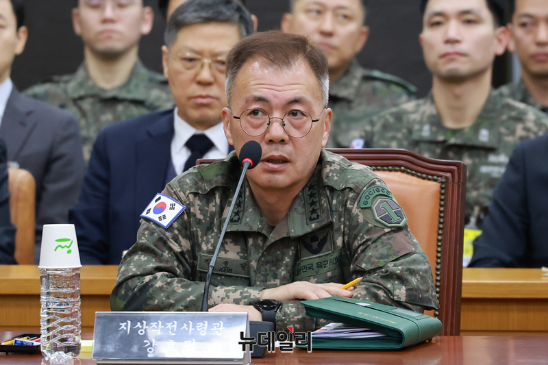 강호필 지상작전사령관이 21일 오전 국회에서 열린 윤석열 정부의 비상계엄 선포를 통한 내란 혐의 진상규명 국정조사특별위원회 전체회의에서 출석해 의원들의 질문에 답하고 있다.
