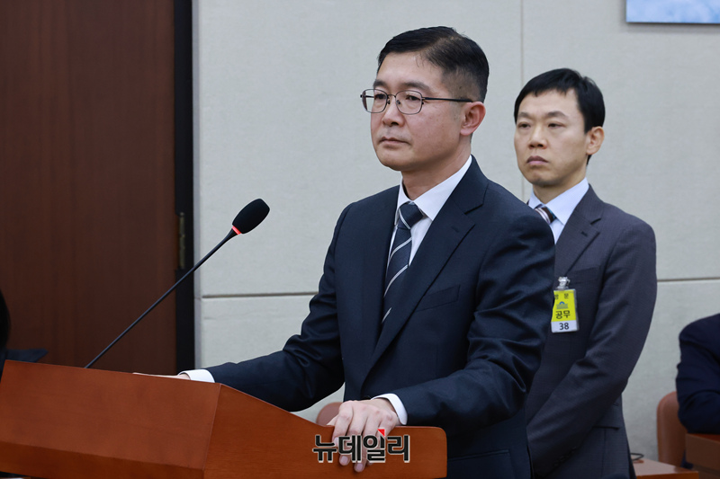 양재응 국방부 국회협력단장과 강태훈 국회협력관이 21일 오전 국회에서 열린 윤석열 정부의 비상계엄 선포를 통한 내란 혐의 진상규명 국정조사특별위원회 전체회의에서 출석해 의원들의 질문에 답하고 있다.