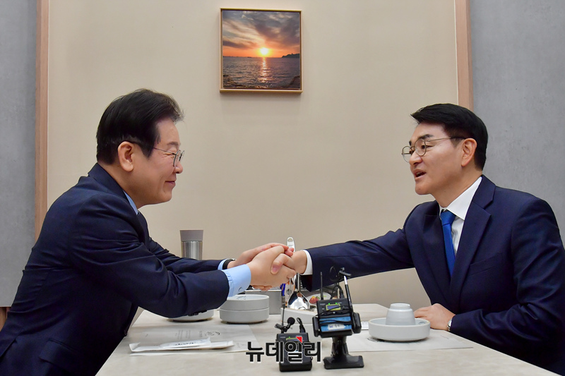 이재명 더불어민주당 대표와 박용진 전 의원이 21일 서울 여의도의 한 식당에서 만나 악수를 하고 있다.