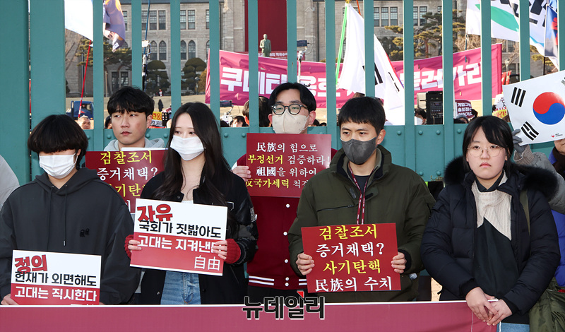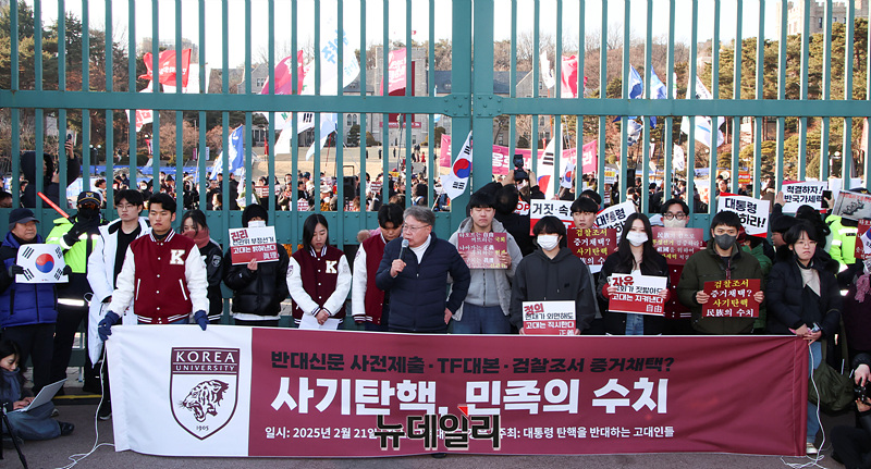 '대통령 탄핵을 반대하는 고대인들' 주최로 열린 고려대 탄핵반대 시국선언이 진행중인 21일 오후 서울 성북구 고려대학교 정문 앞에는 시국선언이 진행되고 있다.