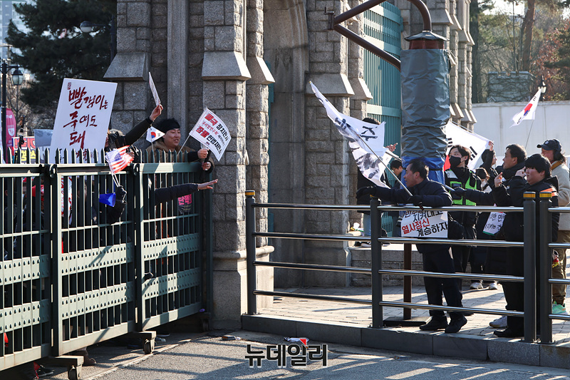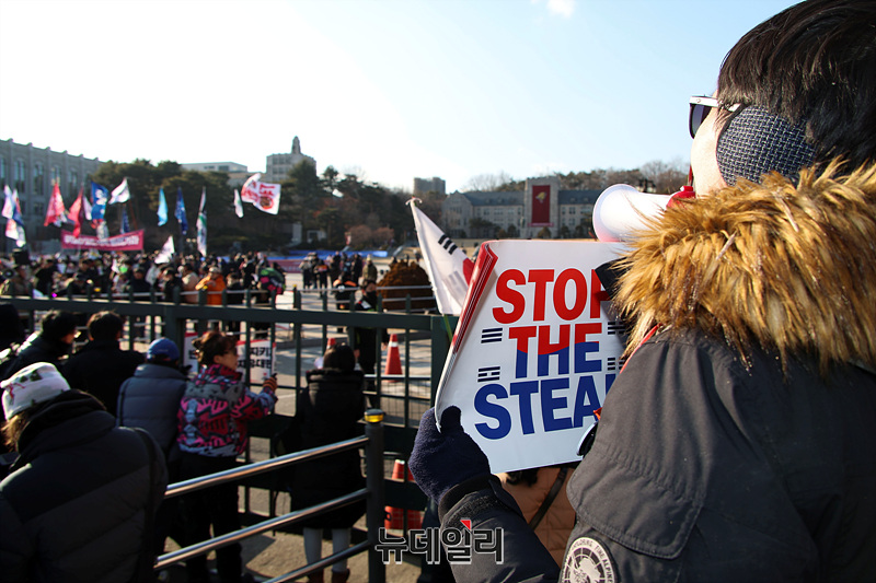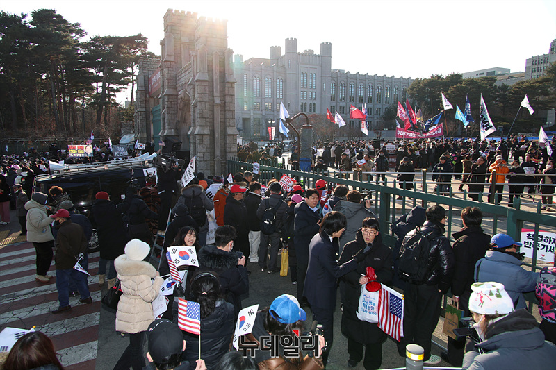 '대통령 탄핵을 반대하는 고대인들' 주최로 열린 고려대 탄핵반대 시국선언이 진행중인 21일 오후 서울 성북구 고려대학교 정문 앞에는 탄핵 반대 집회가 진행되고 있다.