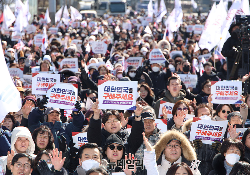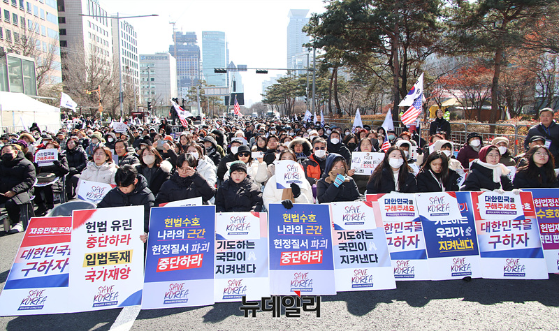 윤석열 대통령 탄핵을 반대하는 세이브코리아 국가비상기도회가 22일 오후 서울 여의도 국회의사당 앞에서 진행되고 있다.