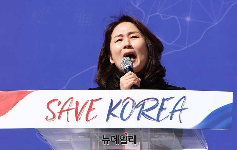 박소영 국민수사대 대표가 22일 오후 서울 여의도 국회의사당 앞에서 열린 윤석열 대통령 탄핵을 반대하는 세이브코리아 국가비상기도회에서 발언하고 있다.