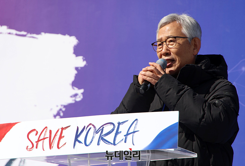 한성천 전 중앙선거관리위원회 노조위원장이 22일 오후 서울 여의도 국회의사당 앞에서 열린 윤석열 대통령 탄핵을 반대하는 세이브코리아 국가비상기도회에서 발언하고 있다.