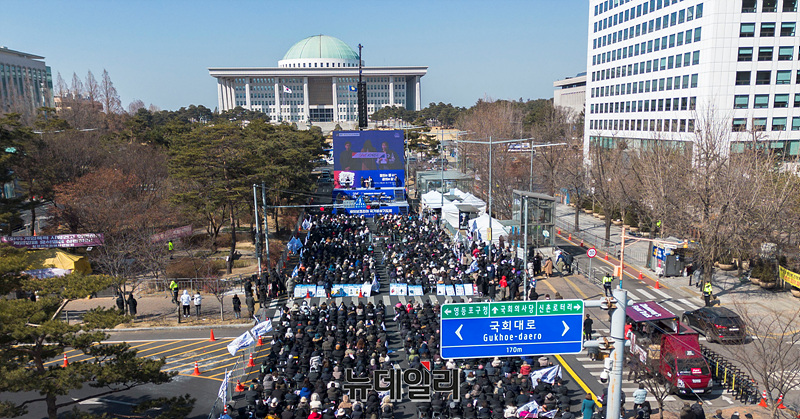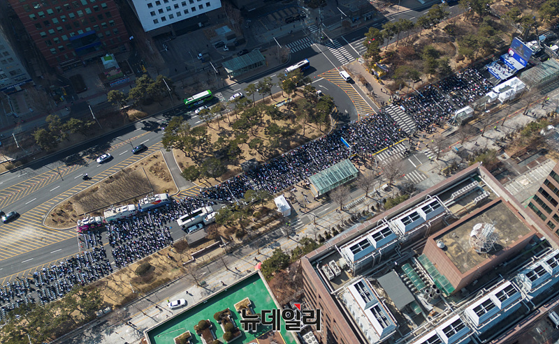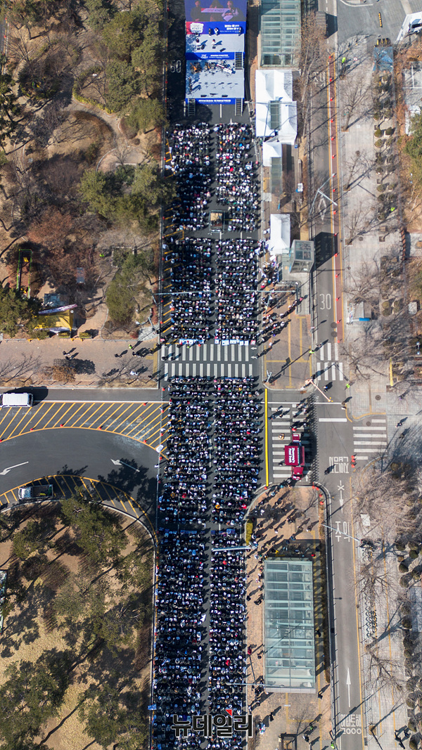 윤석열 대통령 탄핵을 반대하는 세이브코리아 국가비상기도회가 22일 오후 서울 여의도 국회의사당 앞에서 진행되고 있다.