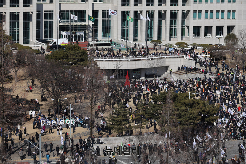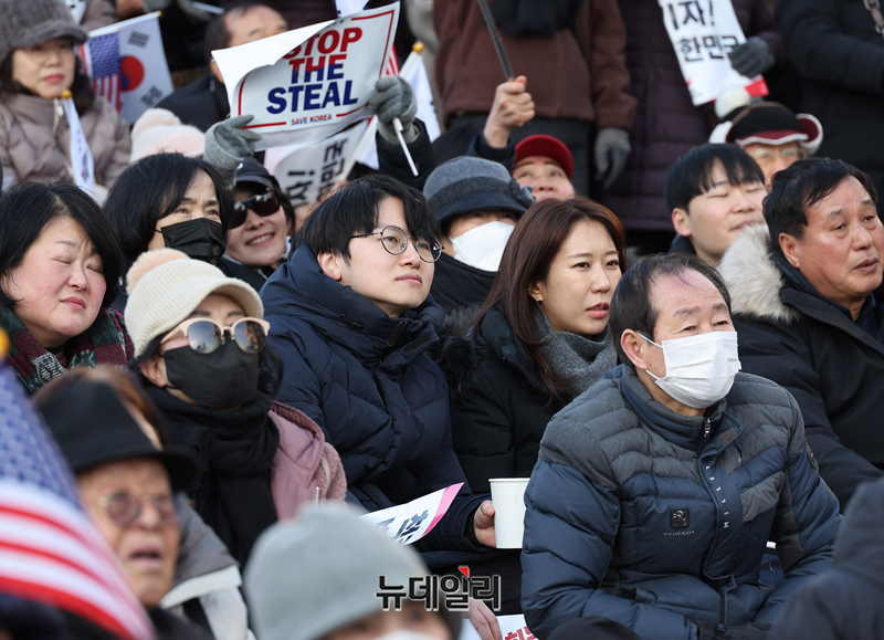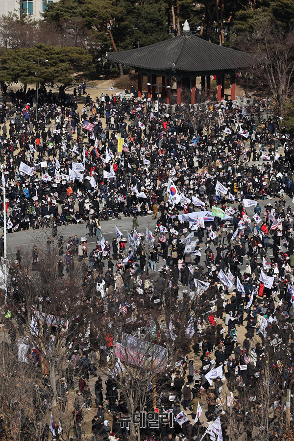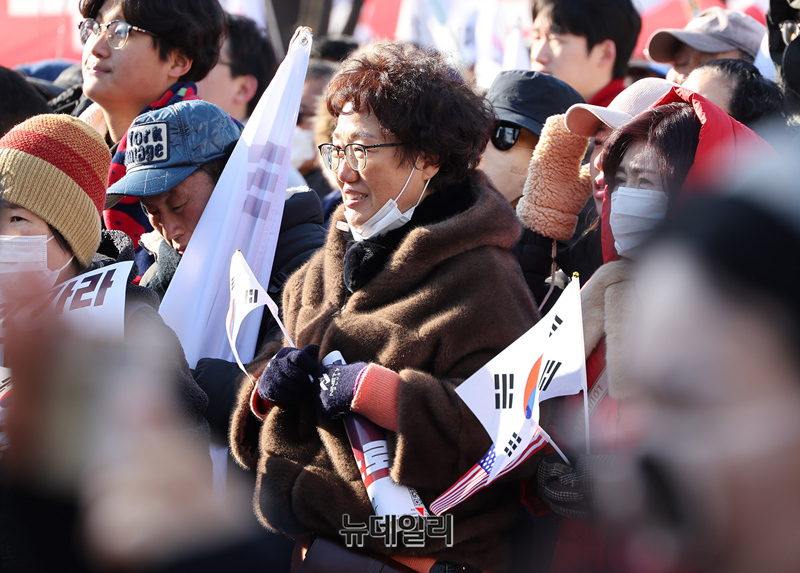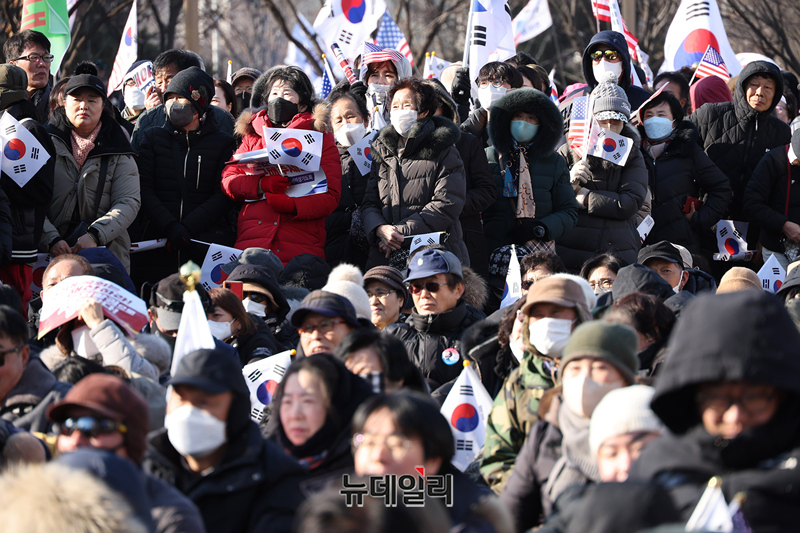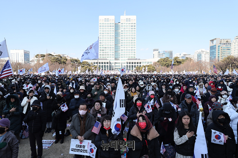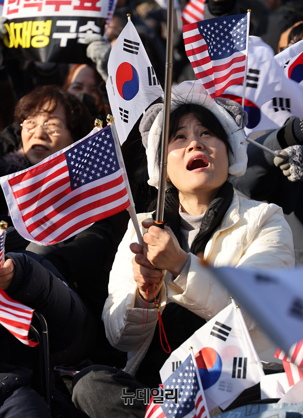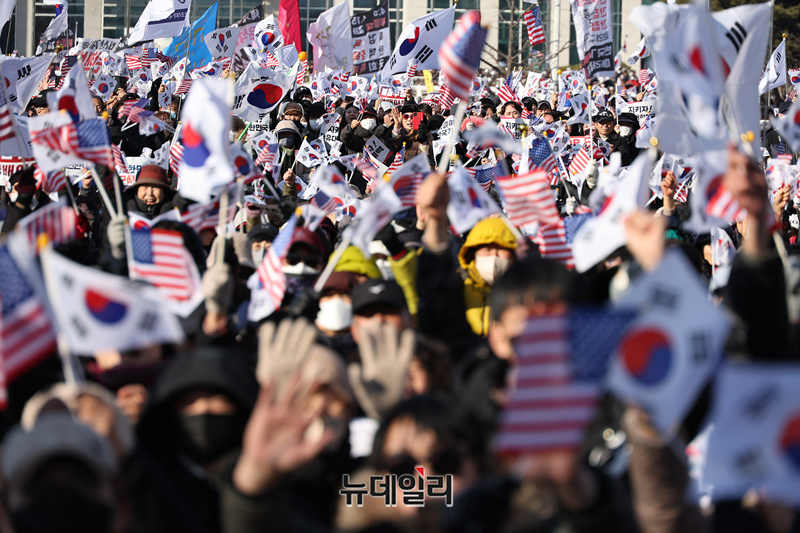 윤석열 대통령 탄핵반대 ‘세이브코리아(Save Korea) 국가비상기도회’ 참석자들이 22일 오후 대전시청 남문광장에서 열린 기도회에서 태극기와 성조기를 흔들며 탄핵반대를 외치고 있다.이날 기도회에는 손현보 목사(세이브코리아 대표), 전한길 강사(대한민국 1타강사), 김병철 전 치안감(경찰청 수사국장), 김근태 전 육군대장(제1야전군사령관), 장동혁 국회의원(국민의힘, 보령‧태안), 김소연 변호사, 개그맨 김영민 씨 등이 참석해 메시지를 전했다.헌법재판소는 윤석열 대통령 탄핵심판의 최종 변론 일정을 2월 25일로 지정했다. (대전=정상윤 기자)