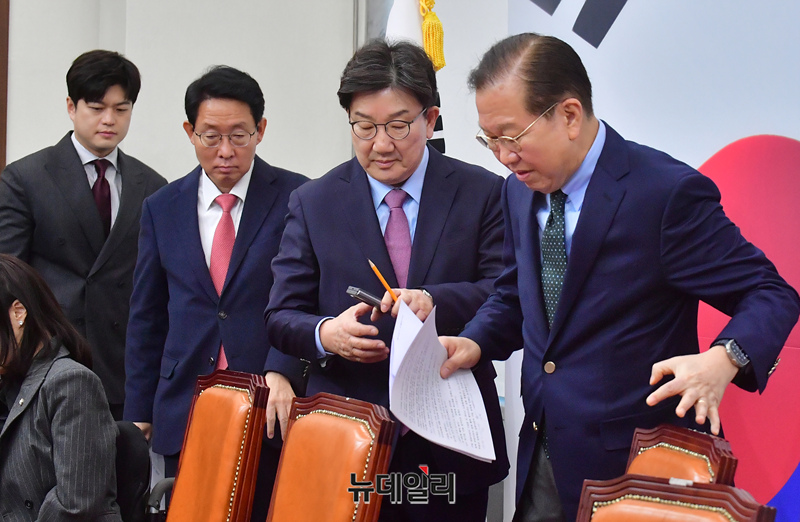 권영세 국민의힘 비상대책위원장과 권성동 원내대표가 24일 오전 국회에서 열린 비상대책위원회의에 참석하기 위해 입장하고 있다.
