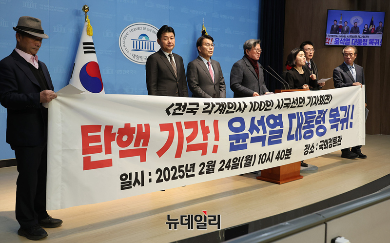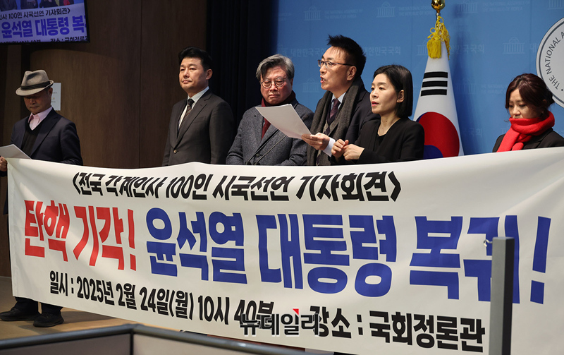 탄핵기각과 윤석열대통령 복귀를 희망하는 전국각계인사 100인이 24일 오전 국회 기자회견장에서 대통령 탄핵 기각을 권고하는 기자회견을 하고 있다.