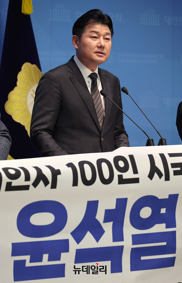 이준배 국민의힘 세종시당협위원장이 24일 오전 국회 기자회견장에서 열린 탄핵기각과 윤석열대통령 복귀를 희망하는 전국각계인사 100인 시국선언에서 발언하고 있다.