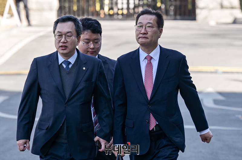 박성재 법무부 장관이 24일 오후 서울 종로구 헌법재판소에서 변호인단과 함께 본인의 탄핵심판 사건 첫 변론준비기일에 출석하고 있다.