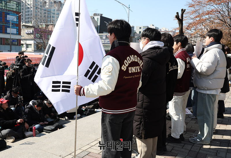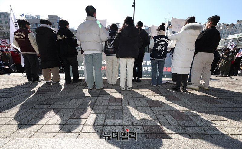자유민주주의를 수호하는 숭실인들이 24일 오후 서울 동작구 숭실대학교에서 윤석열 대통령 탄핵반대를 거부하는 시국선언에 앞서 국민의례를 하고 있다.