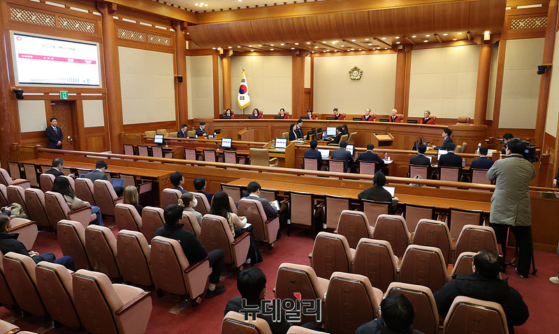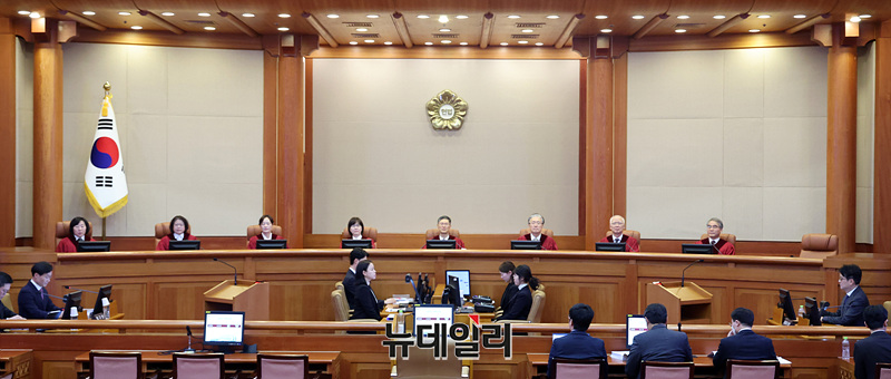 문형배 헌법재판소장 권한대행을 비롯한 헌법재판관들이 24일 오후 서울 종로구 헌법재판소 대심판정에서 열린 이창수 서울중앙지검장·조상원 4차장·최재훈 반부패수사2부장에 대한 탄핵심판 2차 변론기일에 참석하고 있다.