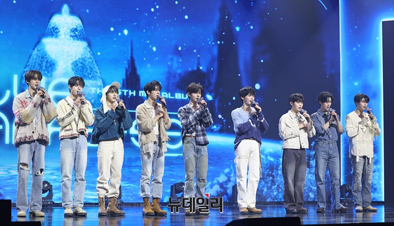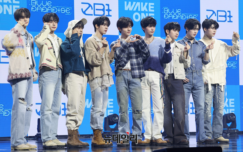 제로베이스원이 24일 오후 서울 용산구 블루스퀘어에서 열린 미니 5집 '블루 파라다이스' 쇼케이스에서 포즈를 취하고 있다.