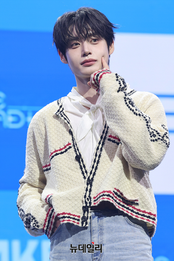 제로베이스원 김지웅이 24일 오후 서울 용산구 블루스퀘어에서 열린 미니 5집 '블루 파라다이스' 쇼케이스에서 포즈를 취하고 있다.