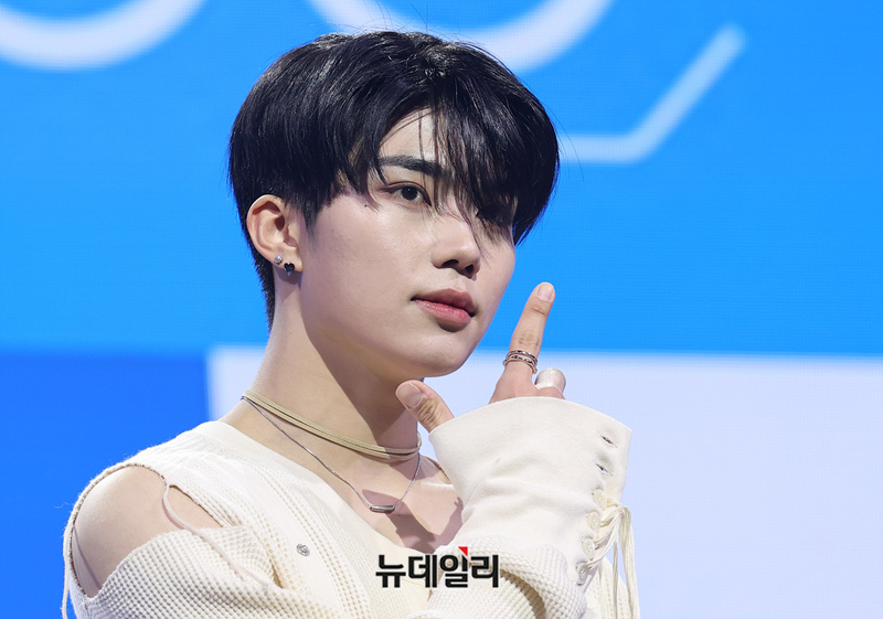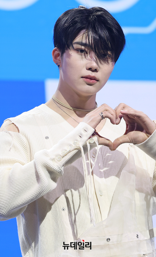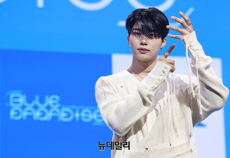 제로베이스원 박건욱이 24일 오후 서울 용산구 블루스퀘어에서 열린 미니 5집 '블루 파라다이스' 쇼케이스에서 포즈를 취하고 있다.