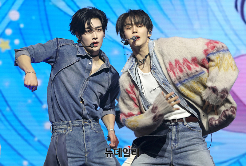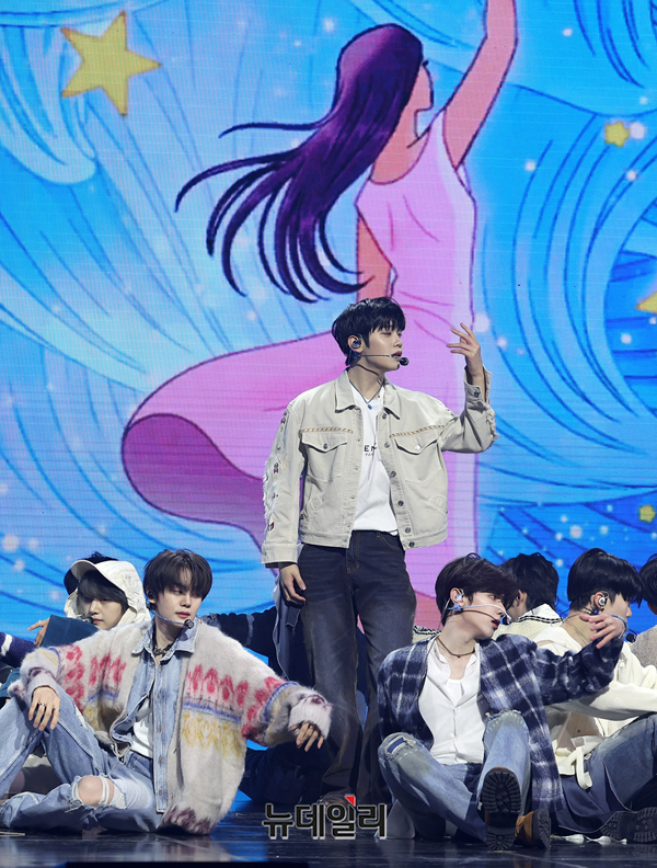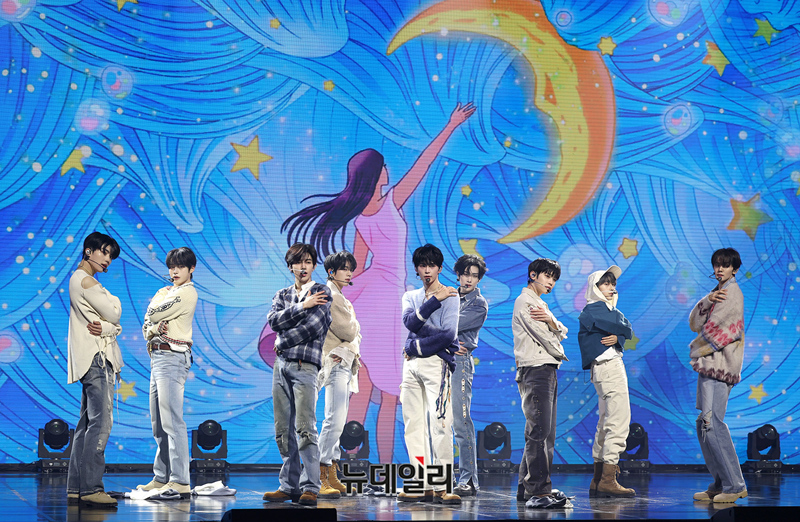 제로베이스원이 24일 오후 서울 용산구 블루스퀘어에서 열린 미니 5집 '블루 파라다이스' 쇼케이스에서 타이틀곡 블루 무대를 선보이고 있다.