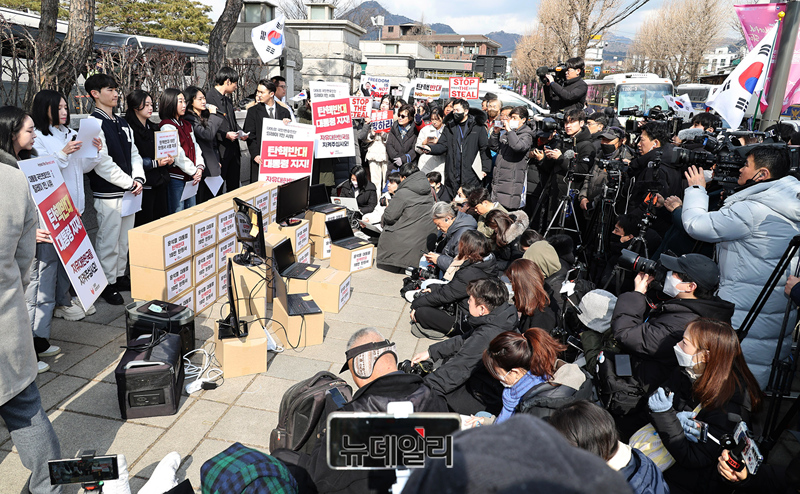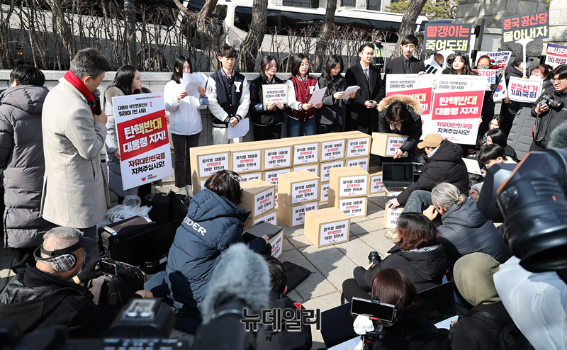 대통령국민변호인단이 탄핵심판 최후 변론을 앞둔 25일 오전 서울 종로구 헌법재판소 앞에서 19만명 탄핵반대 탄원서 제출에 앞서 기자회견을 하고 있다.