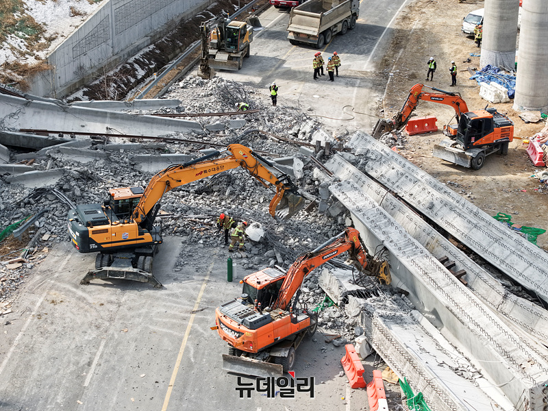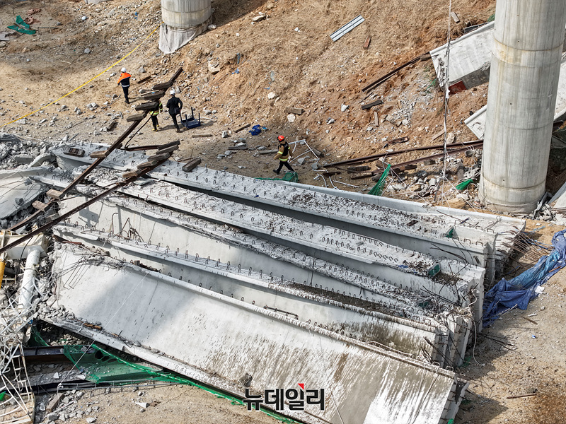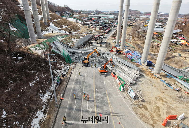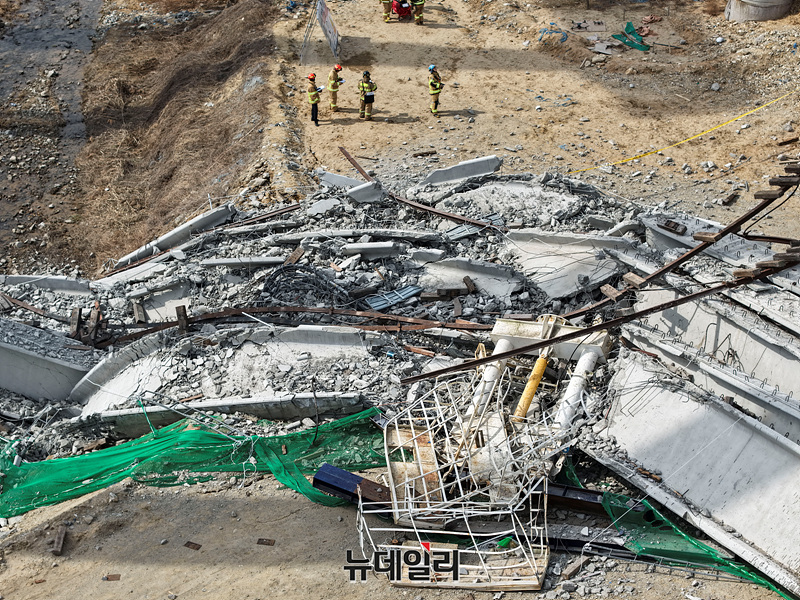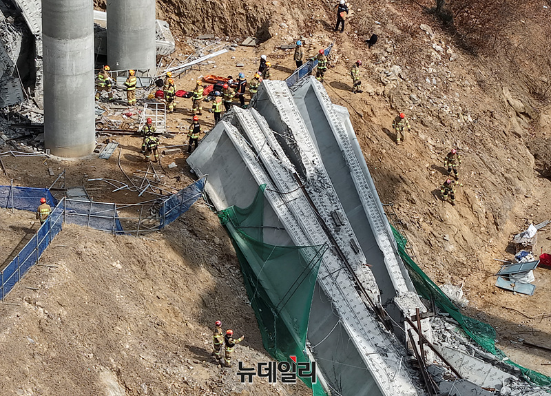 이 사고로 다리 아래에서 작업 중이던 인부 8명이 깔리면서 3명이 숨지고 5명이 부상한 것으로 알려졌다. 소방당국은 오전 10시 3분에 소방대응 2단계를 발령한 데 이어 오전 10시 15분 국가 소방동원령을 발령했다. (경기 안성=서성진 기자)