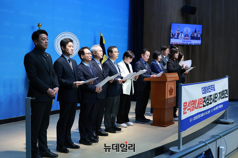 추미애 더불어민주당 윤석열내란 진상조사단장 및 위원들이 26일 오전 국회에서 열린 진상조사단 기자회견에서 발언을 하고 있다.