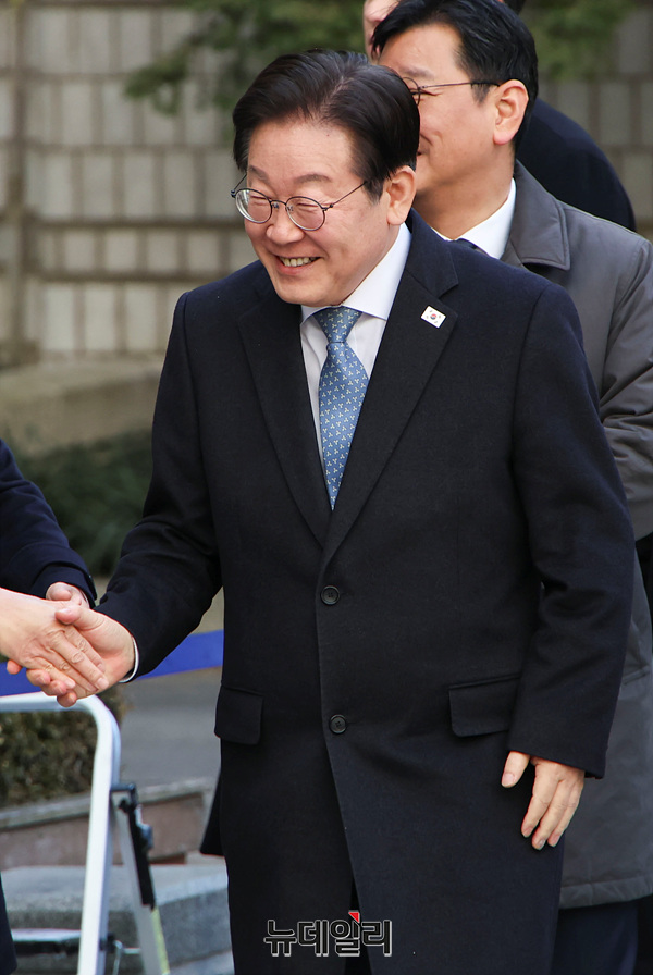 이재명 더불어민주당 대표가 26일 오후 서울 서초구 서울고등법원에서 열린 공직선거법 위반 관련 결심 공판에 출석하며 최기상 민주당 의원과 악수를 나누고 있다.