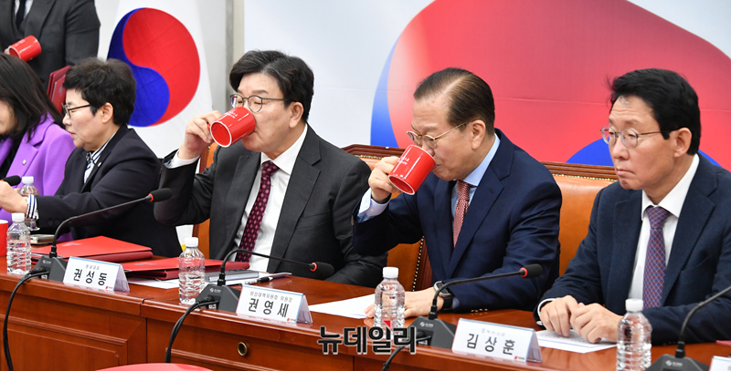 권영세 국민의힘 비상대책위원장과 권성동 원내대표가 27일 오전 국회에서 열린 비상대책위원회의에서 물을 마시고 있다.