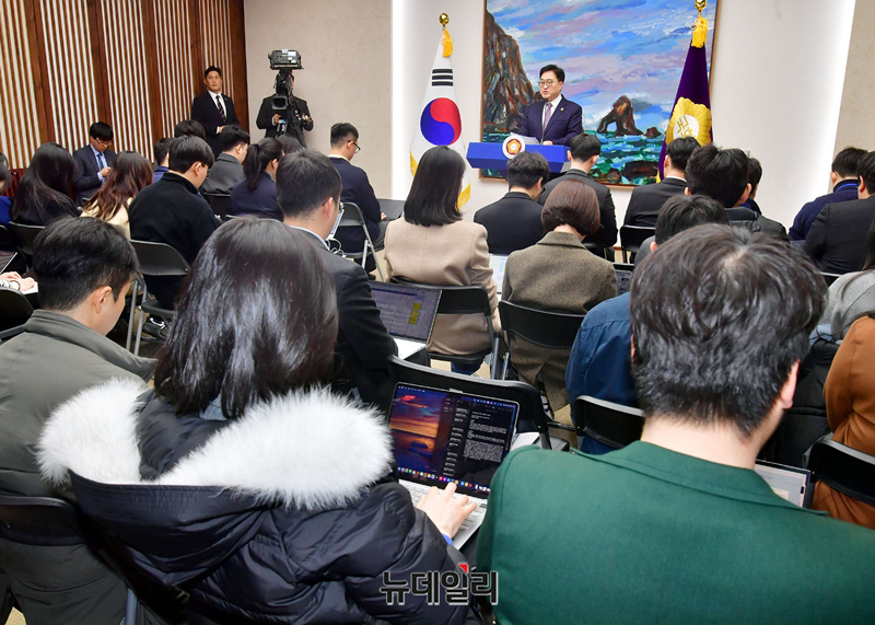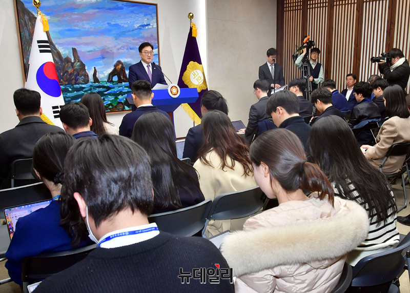 우원식 국회의장이 27일 오후 국회 의장접견실에서 기자회견을 갖고 마은혁 헌법재판관 후보자 미임명 관련 헌법재판소 결정 입장 발표를 하고 있다.