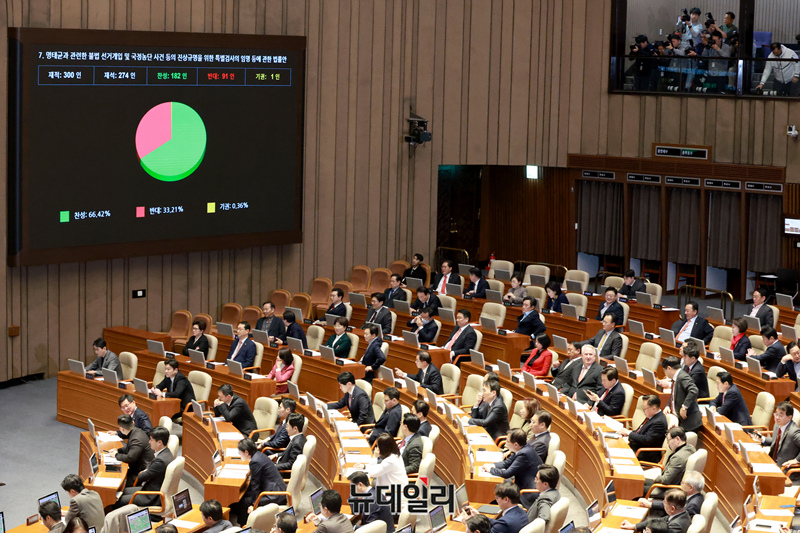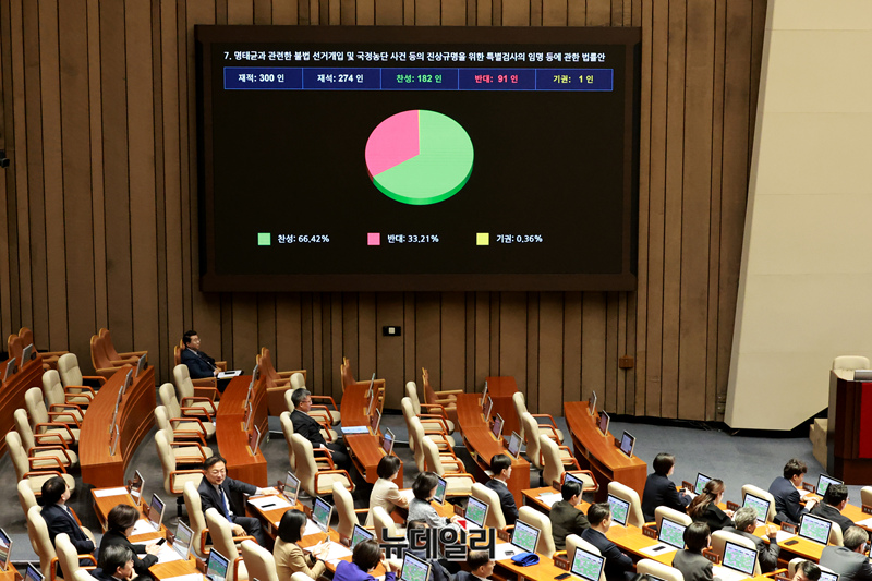명태균과 관련한 불법 선거개입 및 국정농단 사건 등의 진상규명을 위한 특별검사의 임명 등에 관한 법률안이 27일 오후 국회에서 열린 본회의에서 재적 300인, 재석 274인, 찬성 182인, 반대 91인, 기권 1인으로 가결되고 있다.