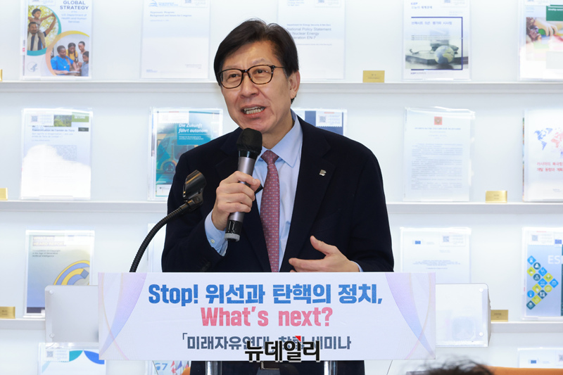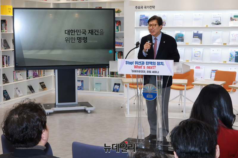 박형준 부산시장이 27일 오후 국회 도서관 국가전략정보센터에서 열린 미래자유연대 창립 세미나에서 '대한민국 재건을 위한 명령'을 주제로 강연을 하고 있다.