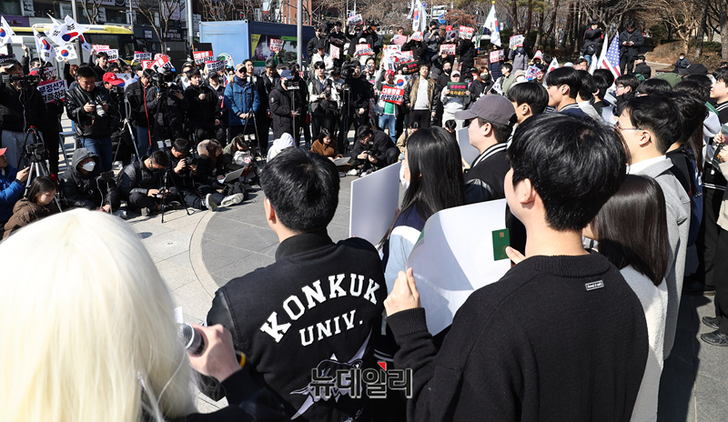 건국대 재학생과 졸업생으로 이뤄진 자유대한민국을수호하는건국인들이 27일 오후 서울 광진구 건국대 청심대 인근에서 윤석열 대통령 탄핵을 규탄하는 시국선언이 열린 가운데 한 참가자가 멸공 손피켓을 들고 있다.